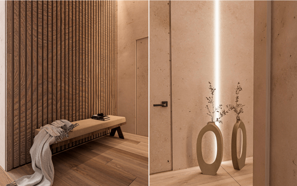 Color Palette: The design revolves around warm shades, including soft beiges, rich browns, and gentle taupe's. These hues are complemented by subtle accents of deep greens and muted golds to add depth and a touch of luxury.